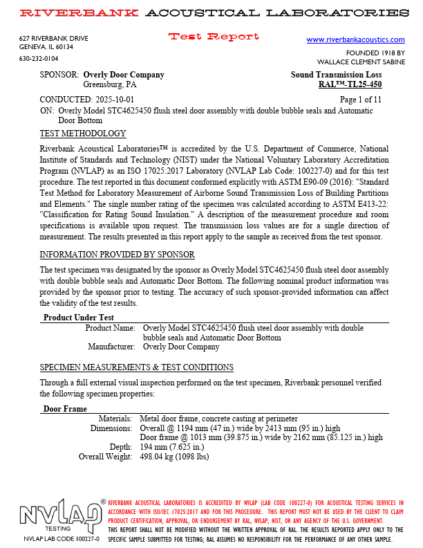 In addition to acoustical testing, Overly has successfully tested this product to the latest UL fire test standard UL10C/UBC 7-2 (positive pressure).